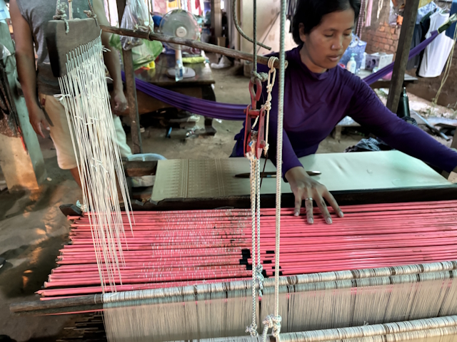 ... werden die Fäden auf einen Holzrahmen aufgezogen und am Webstuhl zu einem Seidentuch verarbeitet. |