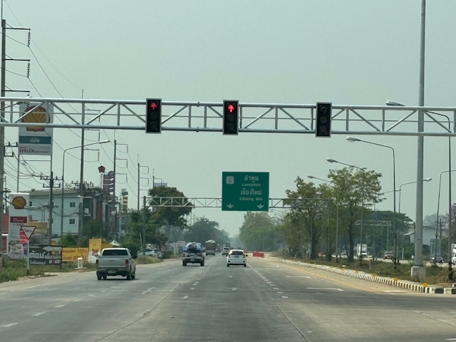 Eine sehr angenehme Fahrt führt durchs Gebirge nach Chiang Rai. Es ist März und die Sonne kommt in diesem Monat stellenweise nicht zum Vorschein. In dem Länderdreieck Thailand, Myanmar und Laos werden jedes Jahr in dieser Zeit die Reisfelder abgebrannt, was zu Rauchwolken über riesige Gebiete führt. |