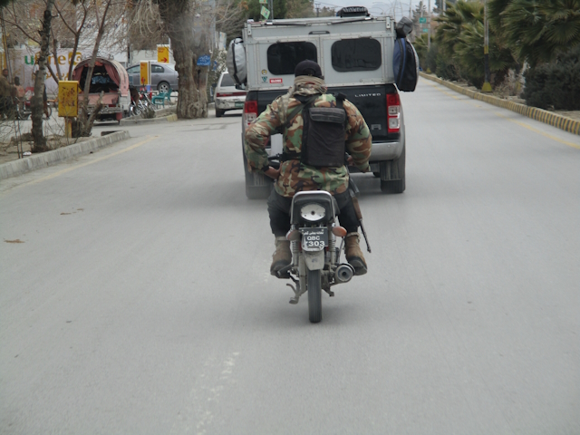 Voraus fährt ein Fahrzeug mit bewaffneten Polizisten. Der Grund für diese Maßnahme ist Belutschistan,